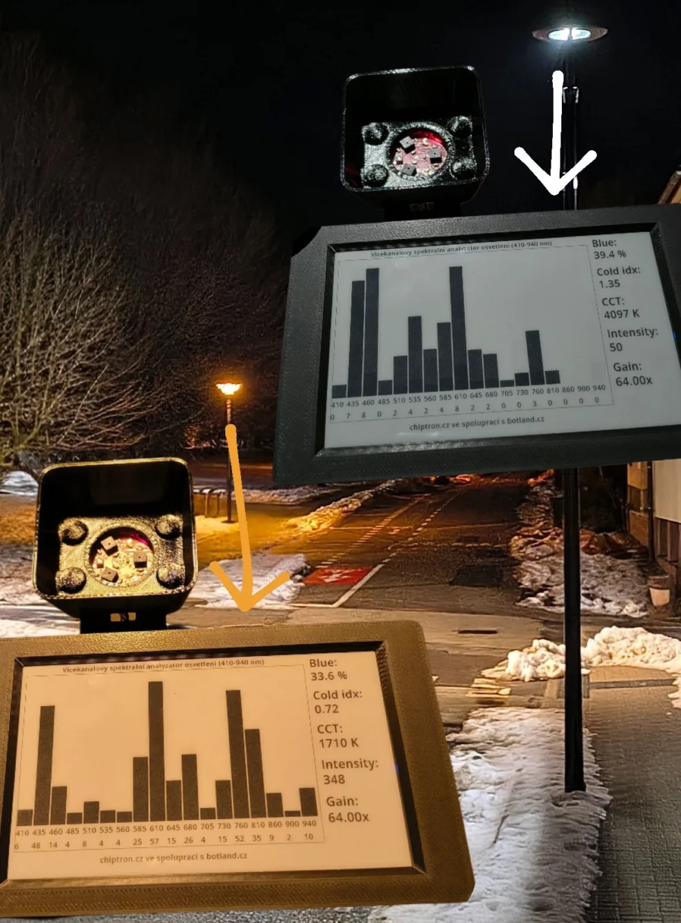 I approached the project as a portable light spectrum analyzer that can measure the light spectrum in the range of 410–940 nm, evaluate the proportion of the blue component, the coldness index of the light, and calculate the correlated color temperature – CCT.