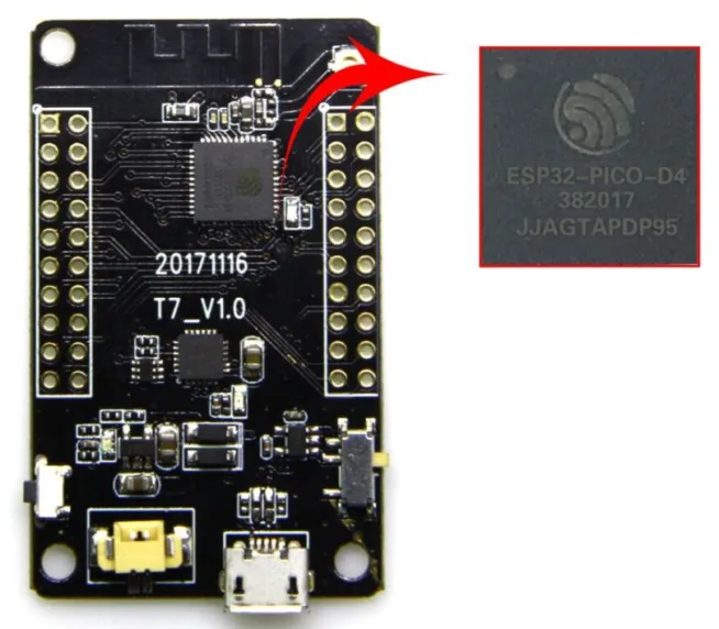 The ultra-small board contains ESP32 in QFN package, crystal oscillator, filter capacitors and antenna. ESP32 includes 4MB FLASH memory.